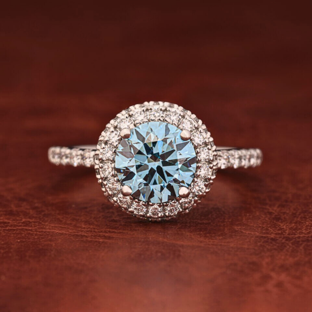 1.50 Ct Blue Round Lab Grown Diamond Halo Engagement Ring with Pave Band