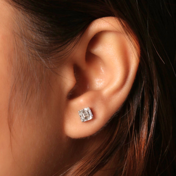 The clean square silhouette of the Asscher cut enhances depth and fire, offering a bold yet elegant look ideal for minimal luxury styling and high-end diamond jewelry collections. These versatile diamond studs elevate both casual and formal looks, making them a must-have in every modern jewelry wardrobe.