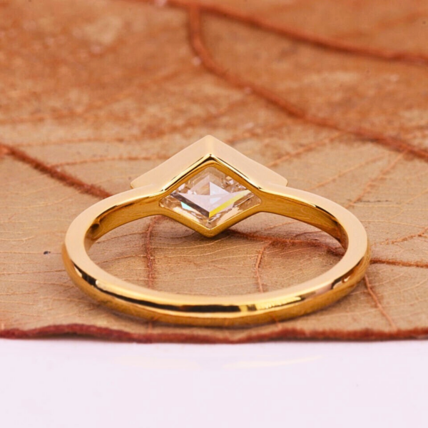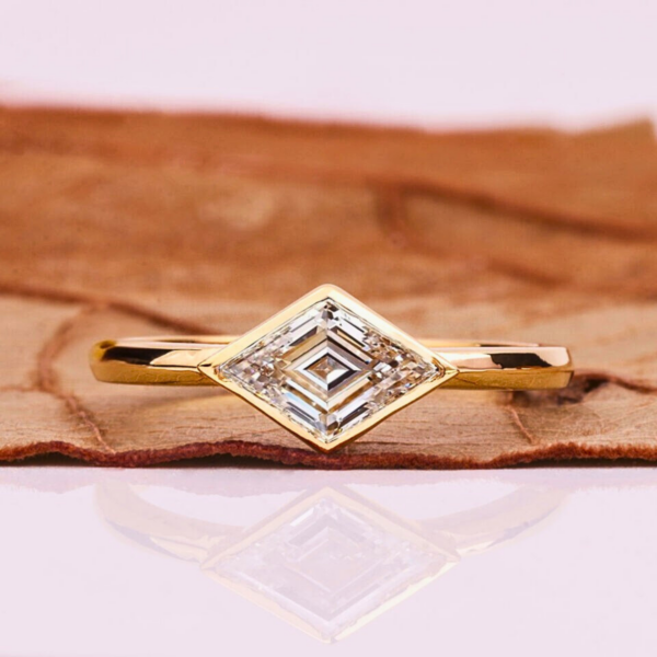 Discover timeless elegance with this east-west lozenge cut lab grown diamond solitaire ring, crafted for those who appreciate minimal luxury and modern sophistication. Designed with a sleek bezel setting and refined gold band, this ring highlights the brilliance and fire of a premium quality lab grown diamond, making it a perfect choice for engagement, proposal, gifting or everyday luxury wear.