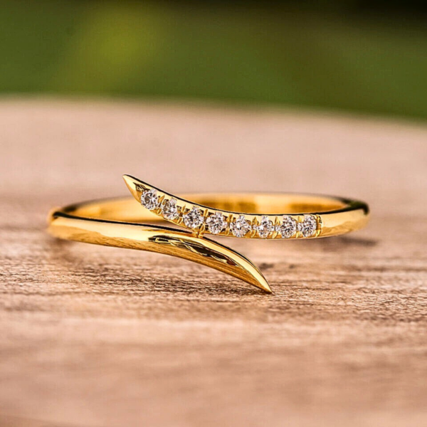 The elegant bypass wave setting enhances each diamond’s natural fire and clarity, creating a refined and luxurious look suitable for modern minimalist jewelry and high-end diamond collections. Its sleek and contemporary design makes it perfect for stacking with engagement rings or wearing solo for a stylish statement.