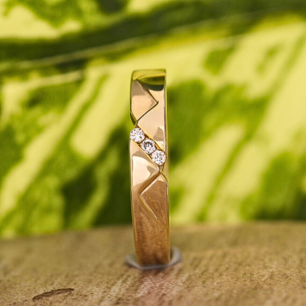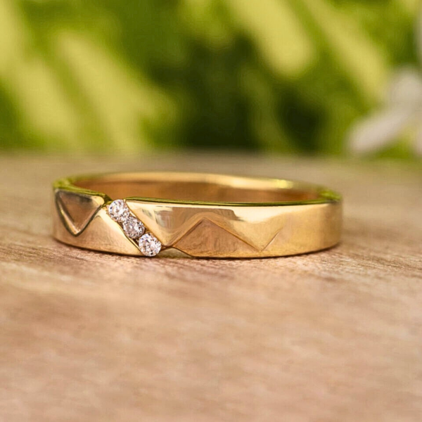 The elegant V-shape groove and angular gold texture enhance the sparkle of the three accent diamonds, creating a refined and stylish look suitable for modern minimalist jewelry collections and everyday luxury wear. Its sleek and contemporary design makes it perfect for stacking with other bands or wearing solo as a signature piece.